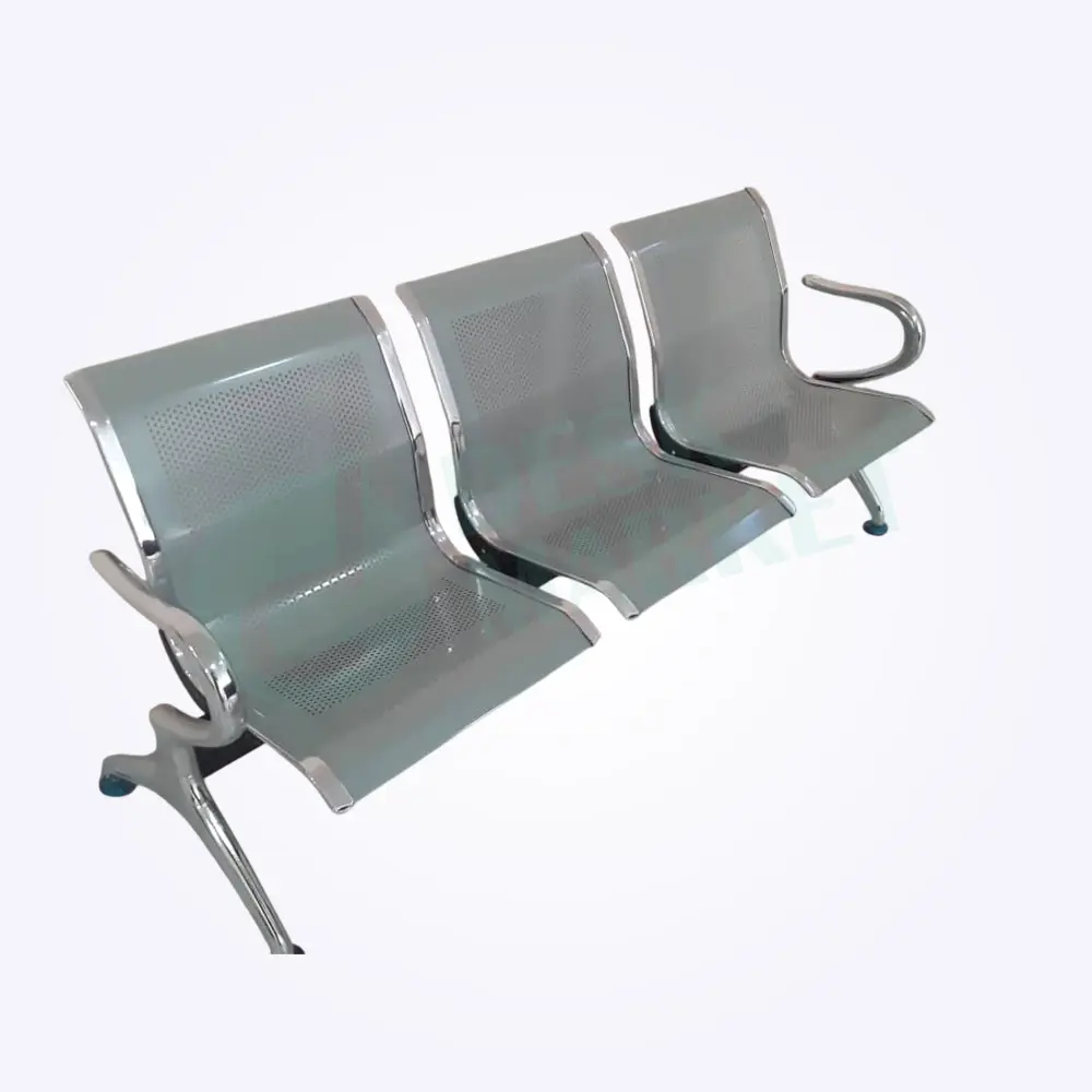 Structure en aluminium robuste ( poutre, dossier, assises et 2 accoudoirs). Assise et dossier en Métal perforé . Piétement en chromé avec sabot de stabilité